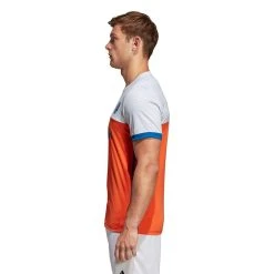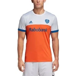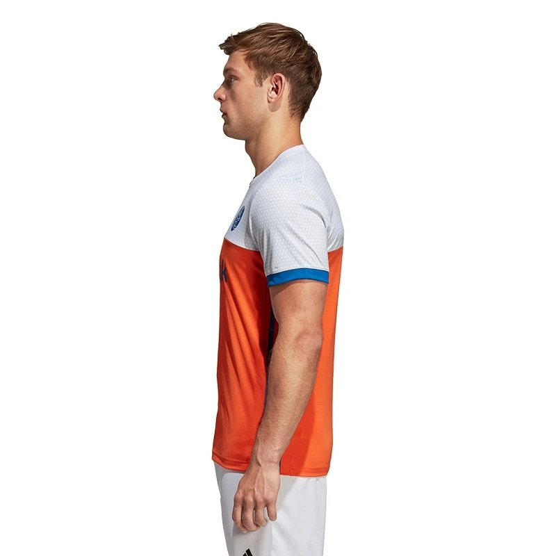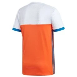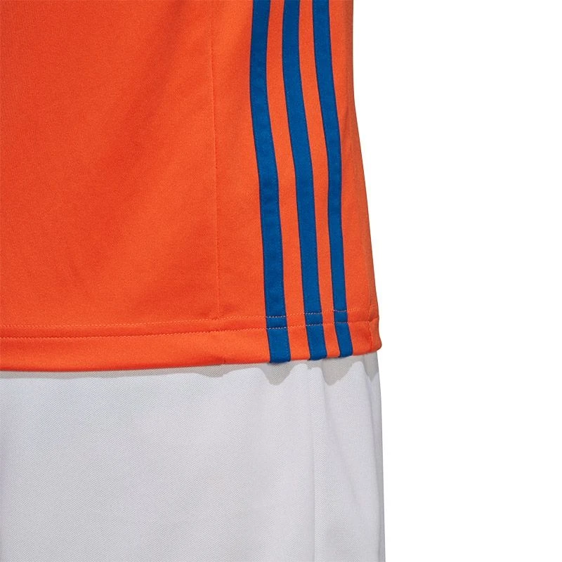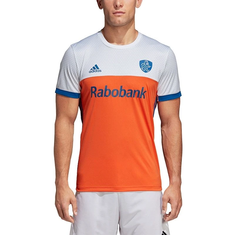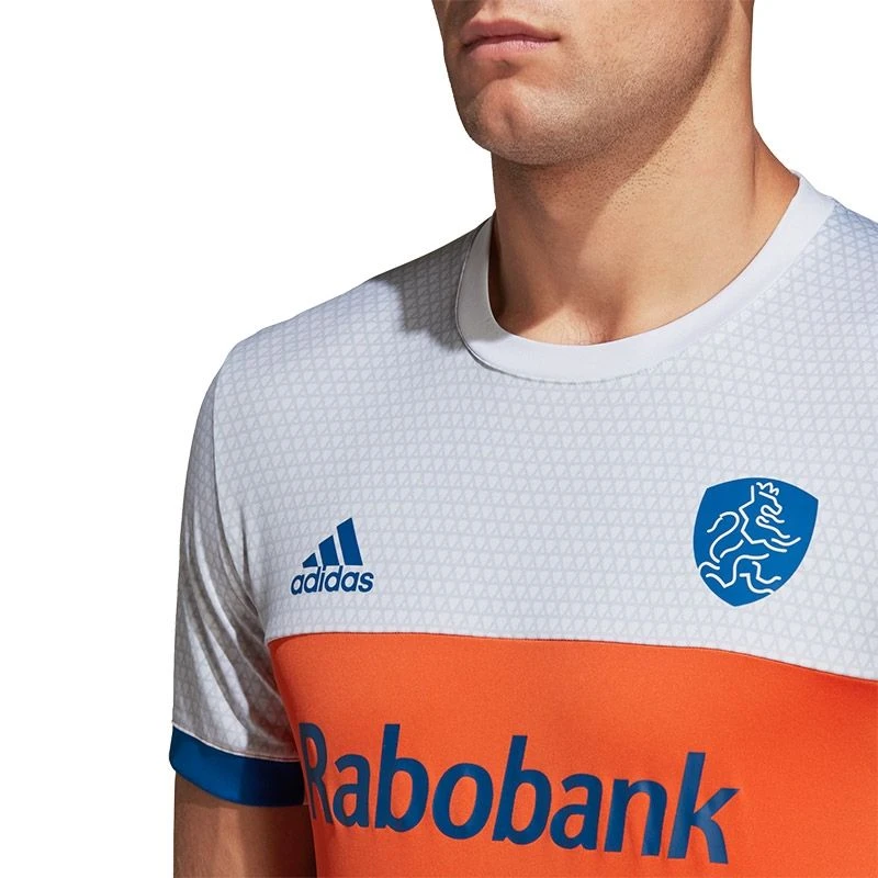 Het shirt bevat een stijlvolle, ronde crewhals die samen met de normale pasvorm zorgt voor een mooie en sportieve uitstraling. Het uitshirt is gemaakt in de bekende kleuren Oranje en wit, met mooie blauwe accenten. De strategisch geplaatste mesh-panelen onder de oksels, op de zijkanten en op de rug zorgen voor extra ventilatie. Het shirt is afgewerkt met de bekende adidas stripes en het KNHB logo op de borst.